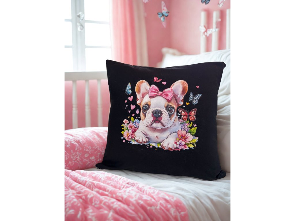 Originální povlak na polštář s roztomilým motivem slečny Francouzského buldočka, který vykouzlí úsměv na každé tváři. Skvěle se hodí např. do dětského pokoje, na pohovku či do křesla a nejlépe jako dárek pro milovníky psů.