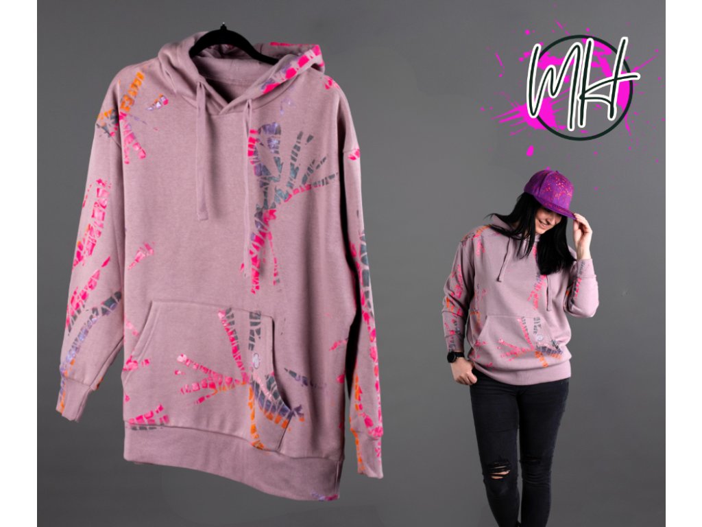 Stylová mikina v jemné růžovofialové barvě s kapucí a výrazným ručním potiskem. Kombinace růžové, oranžové a fialové vytváří jedinečný kontrast a "urban look". Skvěle ladí s džínami i legínami a zaručeně upoutá pozornost.