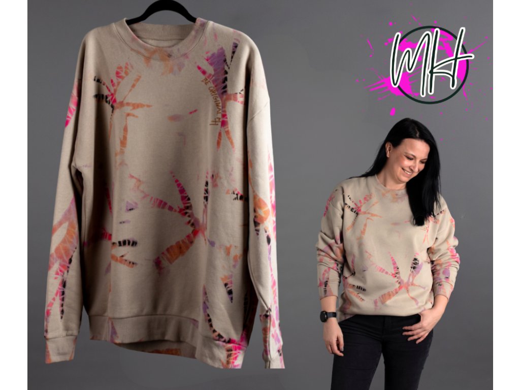 Tahle mikina v pískové barvě s ručním potiskem v odstínech růžové, fialové a oranžové ti přinese pohodlí i styl. Každý potisk je originál, takže budeš mít vždy něco, co nikdo jiný nemá. Pohodlný střih, příjemný materiál a minimalistický nádech rebelství - přesně pro tebe.