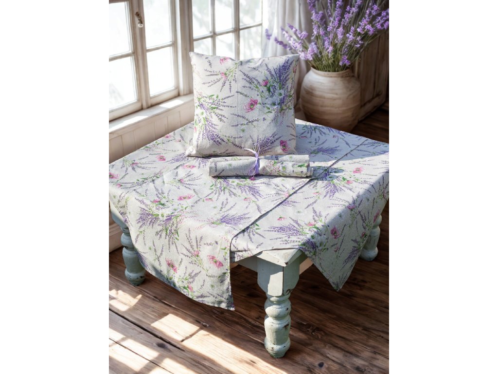 Tento ručně šitý povlak na polštář s motivem levandule a růžových květů na přírodním podkladu přináší do interiéru klid, lehkost a venkovský šarm.