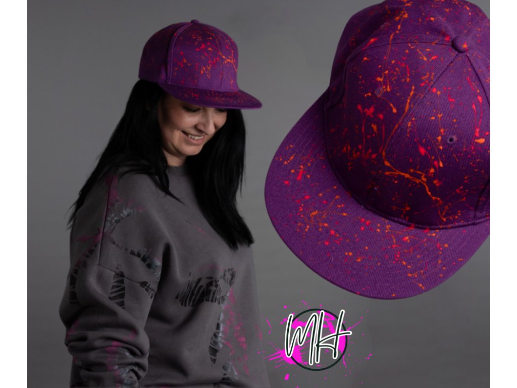 Dodej svému outfitu šťávu! Tato fialová snapback kšiltovka s ručně stříkaným vzorem v neonově růžové a oranžové barvě je ideální pro všechny, kteří chtějí vyčnívat z davu. Každý kus je originál - žádná čepice není úplně stejná. Stylová, odvážná a naprosto jedinečná.